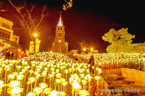 明洞聖堂是一座哥德式教堂,每年都會舉行聖誕節活動慶祝耶穌誕辰,大教堂及周圍可以看到優美裝飾,氣氛莊嚴神聖,教會前方梯級花壇有一片金色花海,美不勝收。